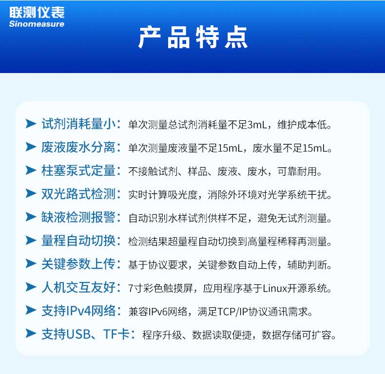 產品名稱:聯測_COD水質在線分析_試劑消耗量小,雙光路式檢測,支持USB、TF卡