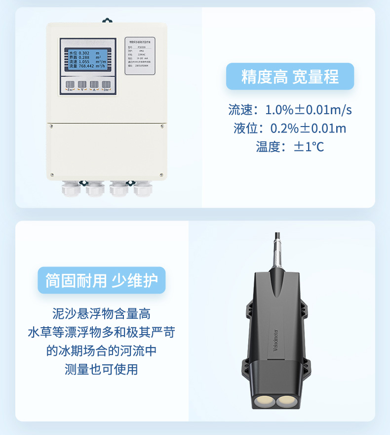 產(chǎn)品描述:本產(chǎn)品是在自然水域或者渠道、管道中測量水的流速、流量的儀表,利用超聲波技術(shù)探測流速,測量點(diǎn)在機(jī)體前方,不破壞流場;測量精度高,測流線性,可測瞬時(shí)流速,也可測平均流速;無轉(zhuǎn)動(dòng)部件,不懼泥沙堵塞和水草纏繞,探頭堅(jiān)固耐用,不存在泥沙堵塞或水草、雜物纏繞等問題,最適用于泥沙懸浮物含量高,水草等漂浮物多和極其嚴(yán)苛的冰期場合的河流中測量。CN1