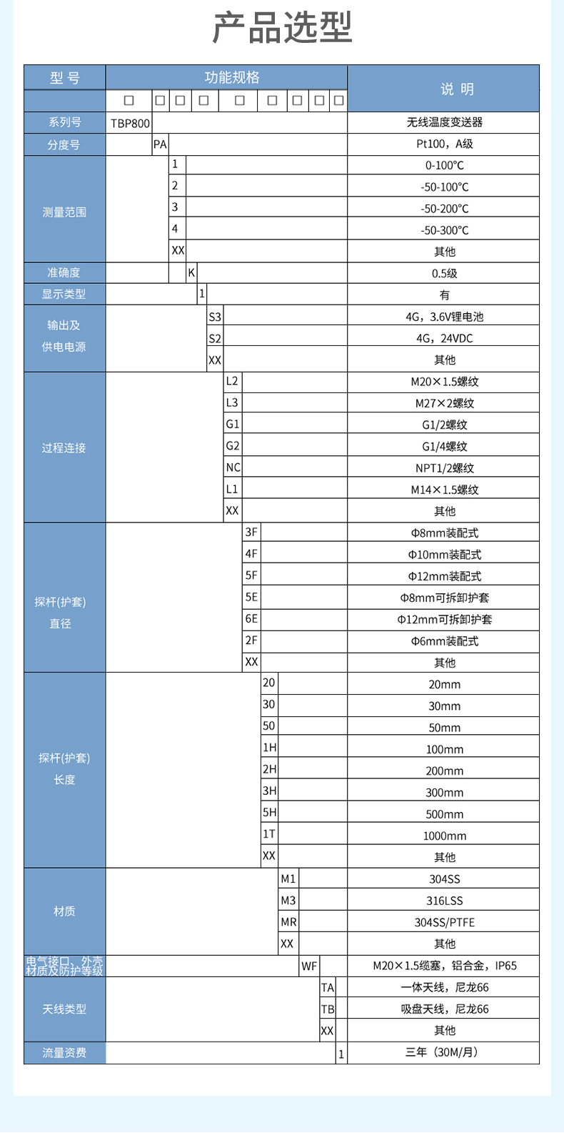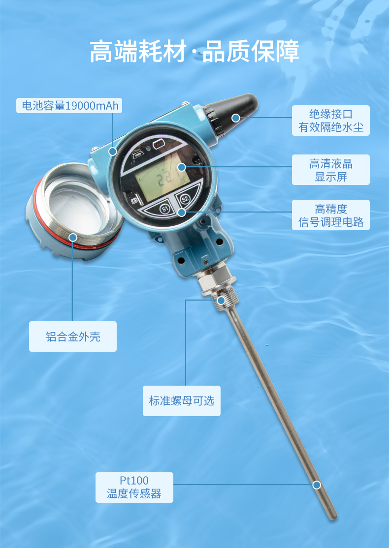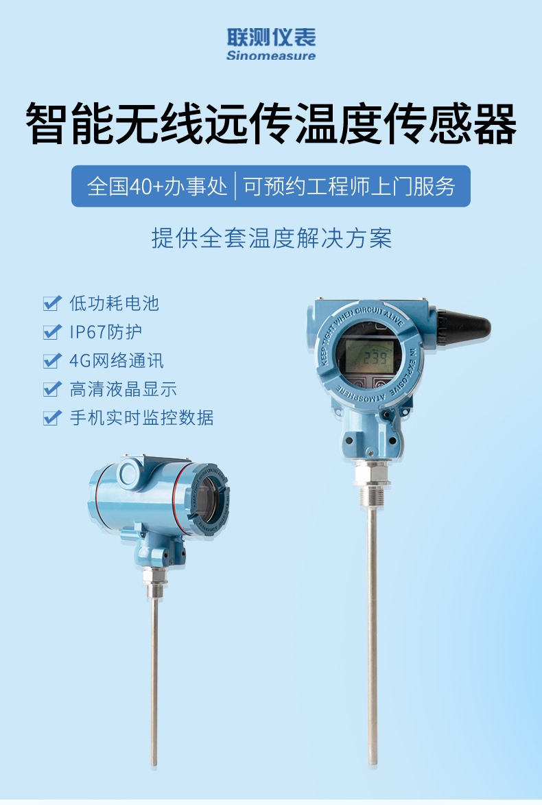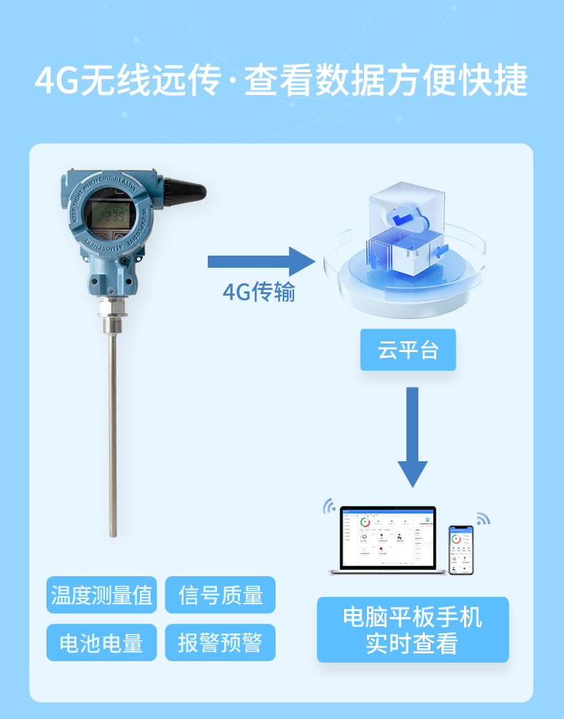 產品描述:無線溫度變送器是基于 4G 無線通訊網絡使溫度的測量、變送、上報為一體的低功耗智能儀表。產品采用 Pt100 溫度傳感器作為敏感元件,高精度信號調理電路,低功耗電池電源管理,豐富的 LCD 顯示界面于一體,周期性上報溫度測量值、電池電量、信號質量等數據,并且能夠在溫度超出設置范圍時及時報警,提前預警故障隱患。