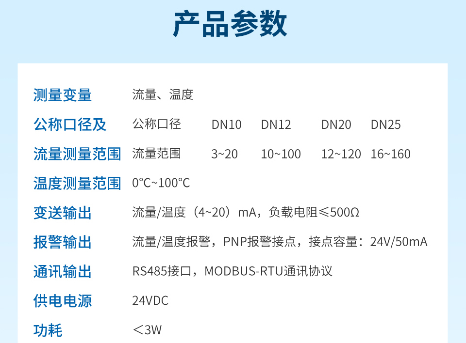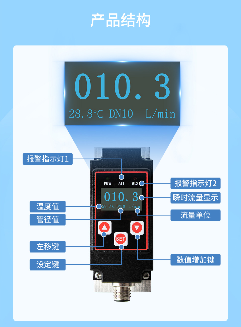 產品描述:微型渦輪流量計結構簡單、精確度高、安裝維修使用方便,可對管道中的液體流量及溫度情況進行實時監(jiān)控,支持流量和溫度(4~20)mA 信號或 485 通信、報警開關輸出,并采用 OLED 實時顯示流體流量及溫度,實現(xiàn)管道當中流量溫度一體式的監(jiān)控功能。本產品廣泛應用于石油化工、電力、治金、鋼廠、造紙、食品加工、水處理、電池廠等行業(yè)。