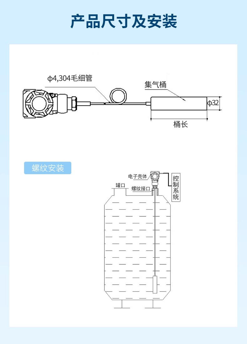 產品描述:集氣桶式液位變送器(下稱變送器)用于測量較高溫度液體介質的液位,原理是被測液體介質壓縮集氣桶內的空氣,空氣壓力通過毛細管傳遞給敏感元件,敏感元件本身不與被測介質直接接觸,因此變送器可以應用在較高溫度的介質環境中,同時,內置微型信號放大處理電路,可以直接與計算機接口卡、控制儀表、智能儀表或 PLC 等連接,進行遠程傳輸。變送器廣泛應用于環保、水利、供水、工業過程控制、變頻供水等較高溫度介質的液位測量。CN2