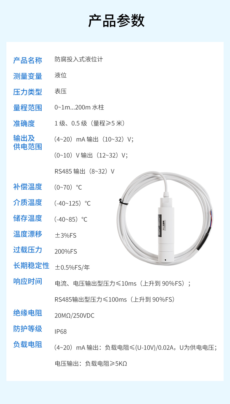 產品描述:防腐投入式液位變送器由高性能陶瓷壓力傳感器作為測量元件,把與液位深度成正比的液體靜壓力準確的測量出來,并經過信號調理電路轉換成標準的電流、電壓或 RS485 信號輸出,建立起輸出信號與液位深度的線性對應關系,實現對液體深度的測量。產品采用聚四氟乙烯防腐材質,具有優良的耐腐蝕性能,廣泛適用于化工廠酸、堿性等腐蝕介質的液位測量。